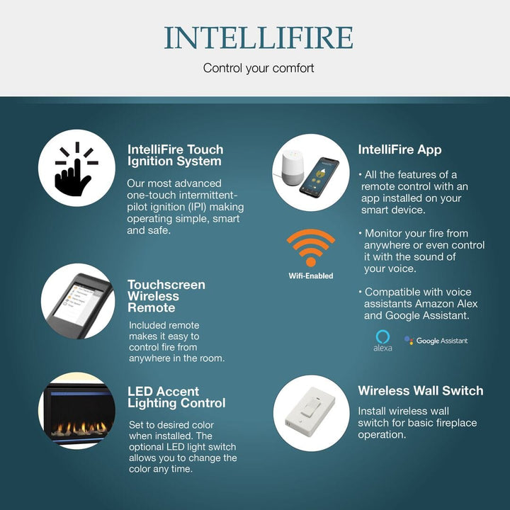 Features a simple, single mode function and is specifically designed for wall placement, ensuring a great fire is just a flip of the switch away. Features battery strength indicator, automatic battery backup, on/off.