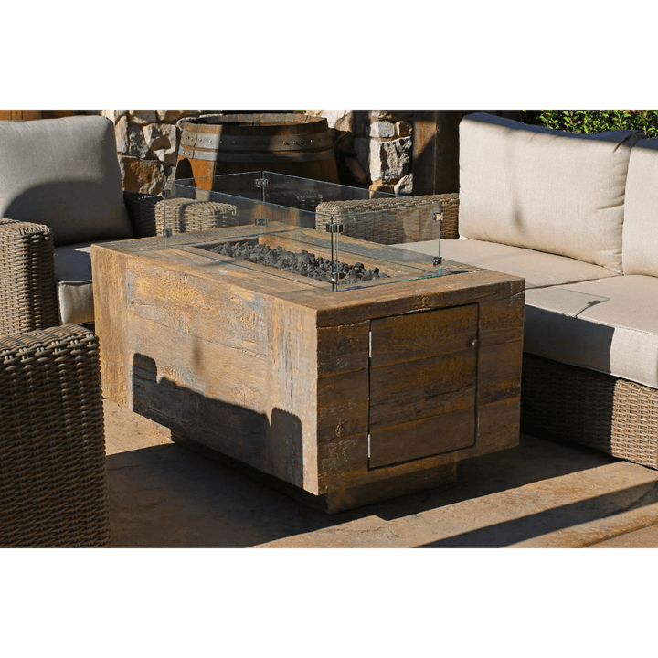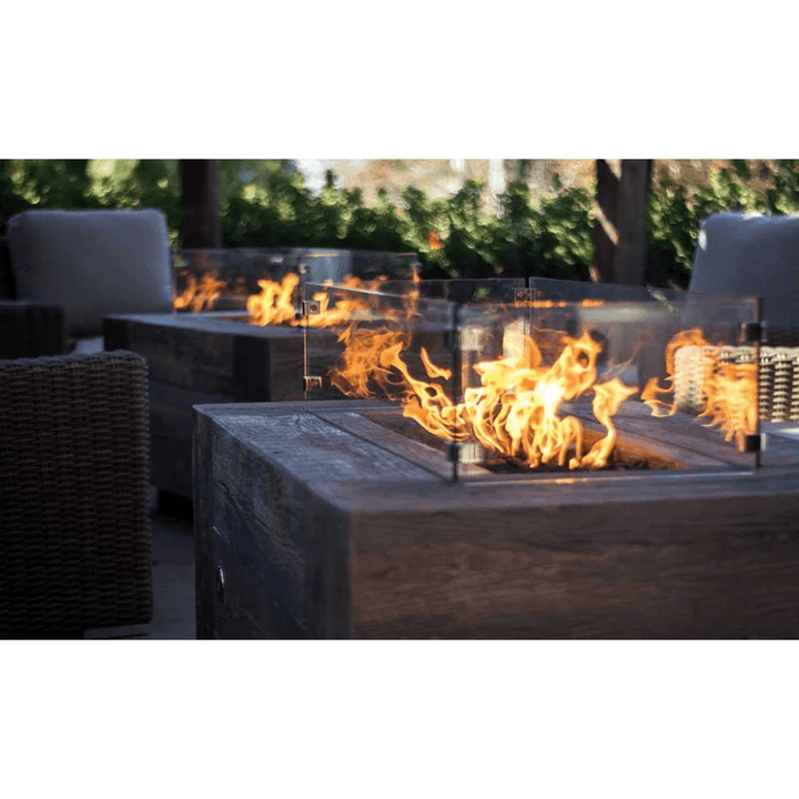 - The rectangular Glass Wind Guard by the Outdoor Plus is an additional element for the protection of your Fire Pit Table. The strong and durable class shield acts as a barrier to winds and protects your flames in a windy environment. It's the perfect addition to your fire feature where extra caution is required. Made of tempered glass, it's assembled to withstand the heat and be of use for many ye