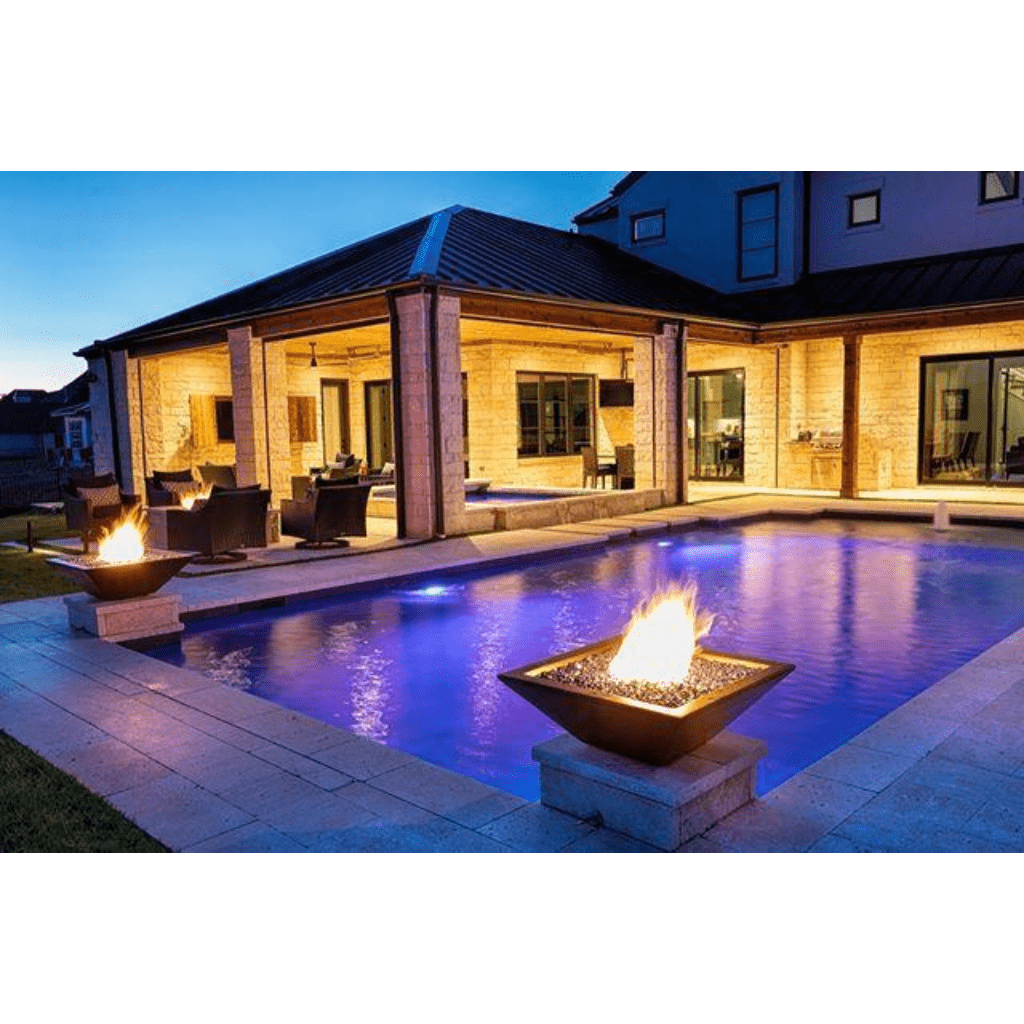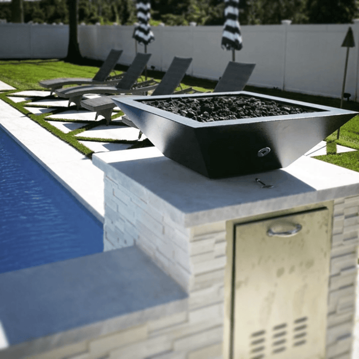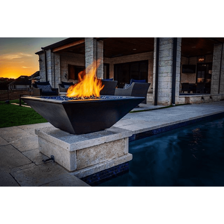 The Outdoor Plus Maya GFRC Square Fire Bowl is available in 24", 30", and 36" sizes.